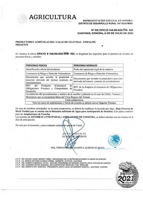 En el oficio OFICIO # 146.00.020.108-021 , se desglosan los requisitos para el permiso de siembra en personas físicas y morales.